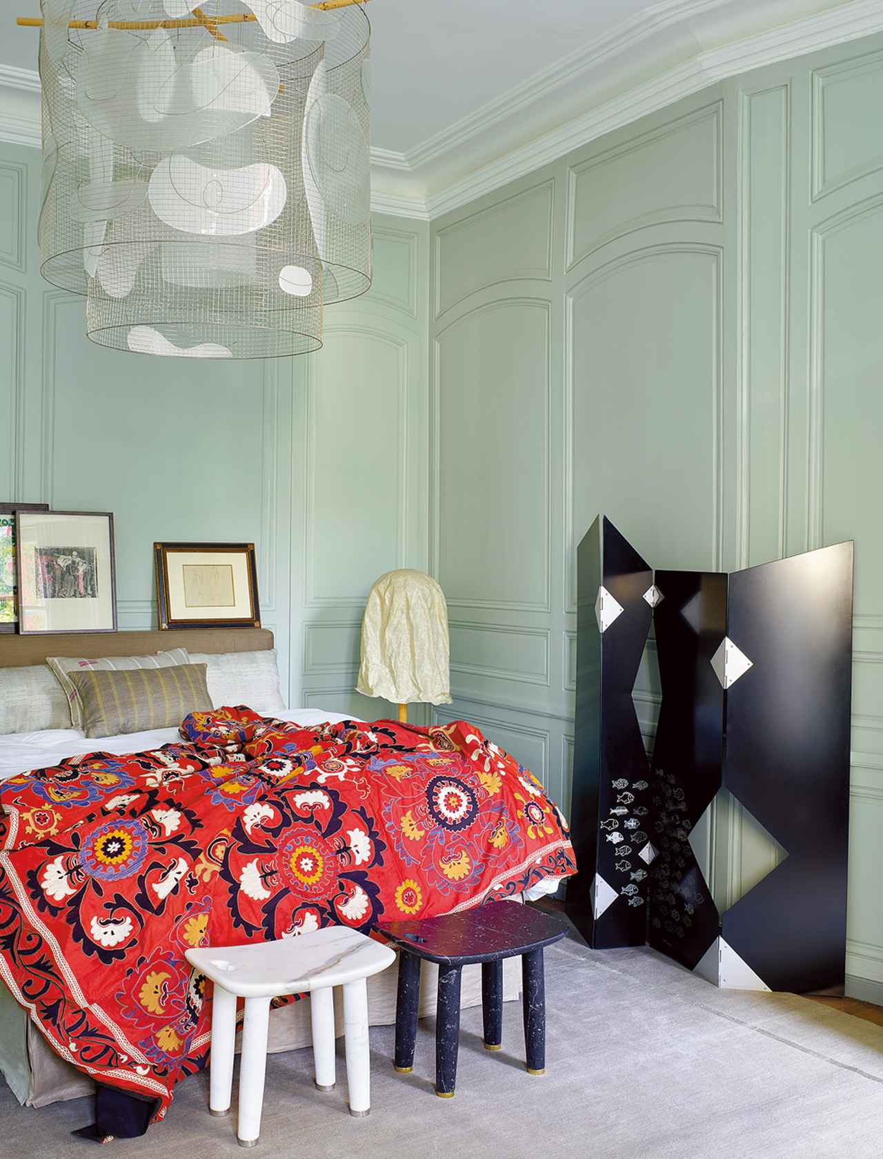 マスターベッドルーム。アンドレア・ブランジのプラトン・シャンデリア(2008年)、ブルーノ・ムナーリのついたて、ザーナの大理石のスツール