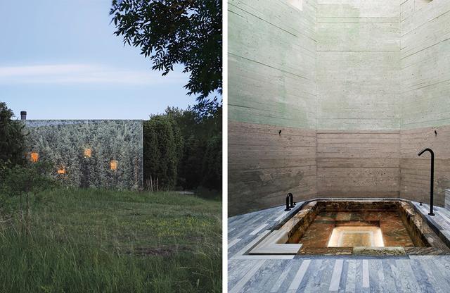 (写真右)スカルソ社が住宅に変身させた冷戦時代のバンカー(掩蔽壕:えんぺいごう)には高さ43フィートのミサイル倉庫があり、その地下3階に大理石が敷かれたハマム(中東でよく見られる伝統的な公衆浴場)がある