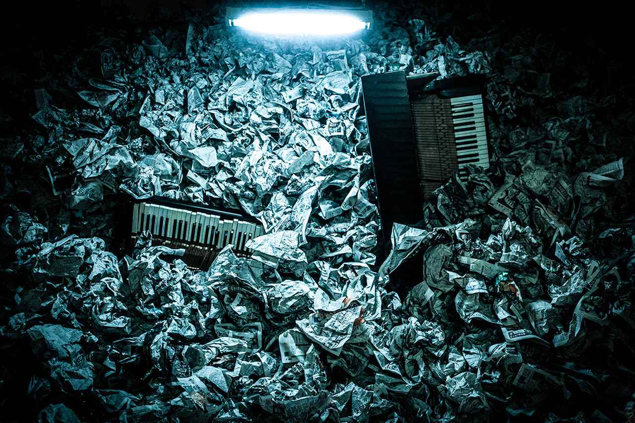 舞台美術家のジャン・カルマンとの共同制作でサミュエル・ベケットの不条理劇から着想した作品。墓場のように夥しい量の古新聞に埋もれて放置されたピアノが姿を現すパフォーマンス/インスタレーションで、向井山は演奏ではなく、インスタレーションと音の制作を担当