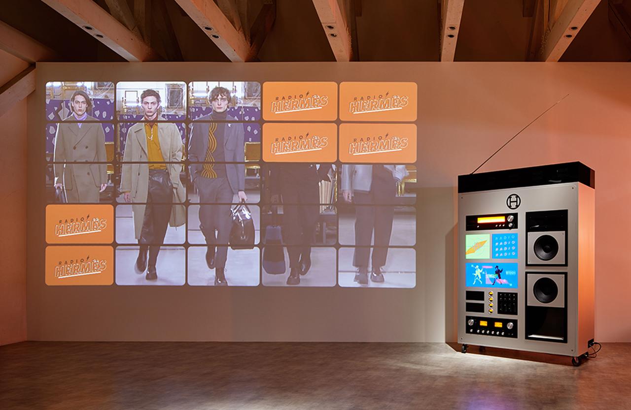会場内に流れるオンエア中の番組を聴きながら、映像や実物のアイテムとともに、エルメスの2019年秋冬メンズコレクションの世界を体感できる