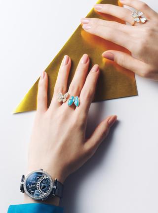 腕時計「レディ アーペル ポン デ ザムルー」〈38㎜/WG、ダイヤモンド、自動巻き、時針、分針ともにレトログラード、オンデマンド アニメーションモジュール、36時間パワーリザーブ、アリゲーターストラップ(交換可能なストラップ1本付属)〉¥16,500,000、リング(左手)「ドゥ パピヨン アントレ レ ドア」〈YG、WG、ダイヤモンド、ターコイズ〉¥2,877,600、(右手)「スウィート アルハンブラ エフイヤージュ」〈YG、ダイヤモンド、MOP〉¥621,500/ヴァン クリーフ&アーペル