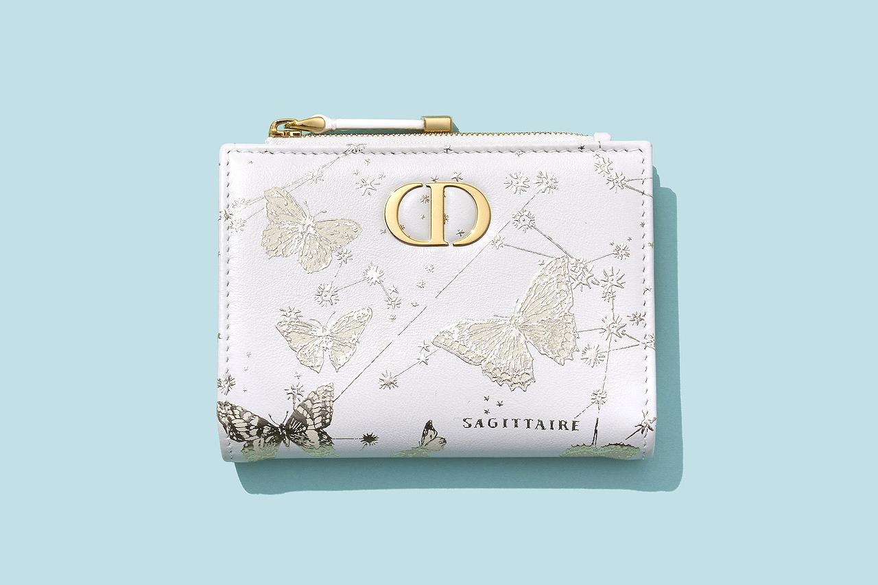 星座のように配置された軽やかに舞う蝶が艶やかな印象に誘う。エレガントなホワイトのウォレットは無限大の可能性を秘めたデザインだ。随所に輝くゴールドカラーのアクセントも今年のラッキーカラー。財布<W11.5xH9xD2cm>¥105,000/ディオール